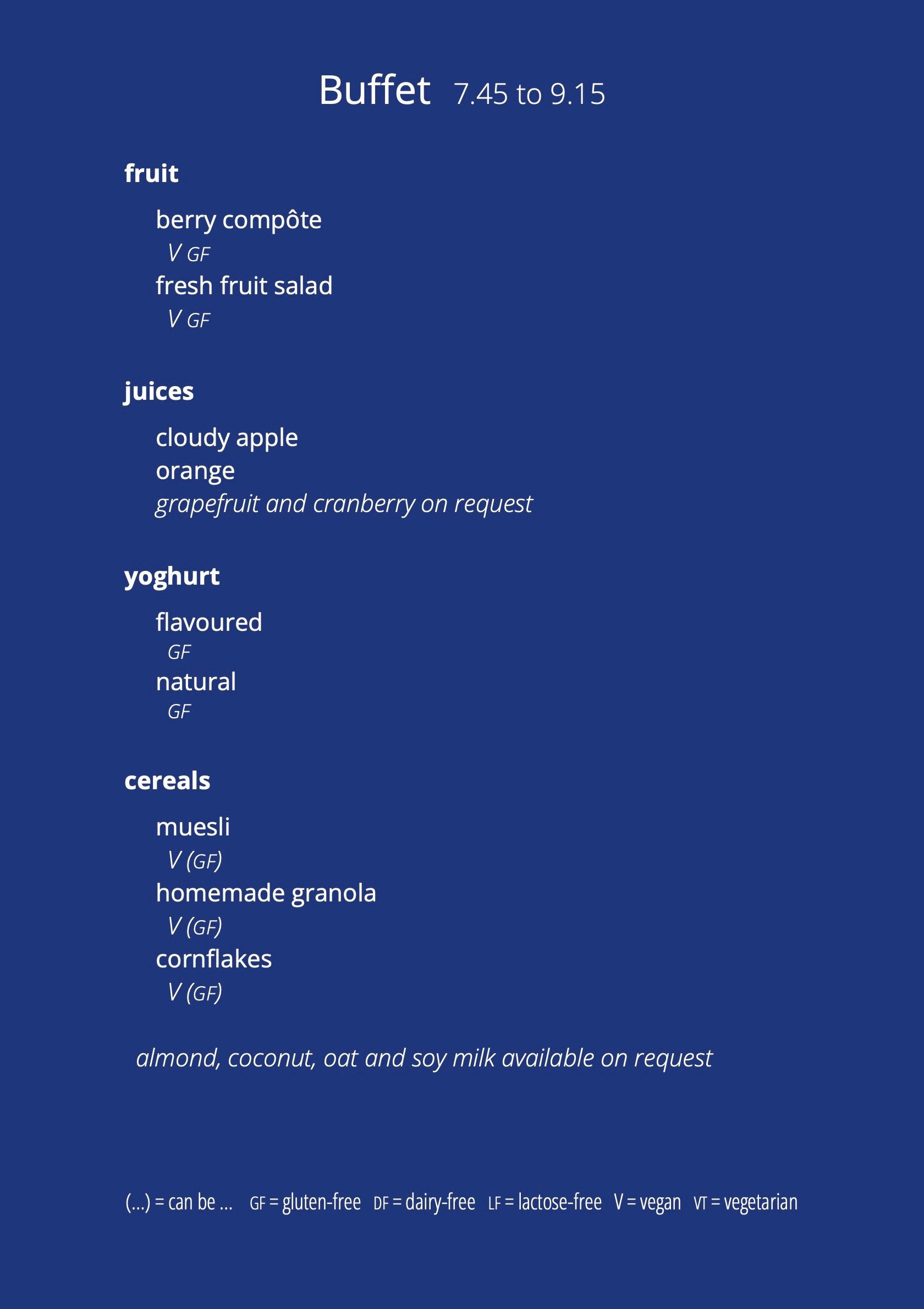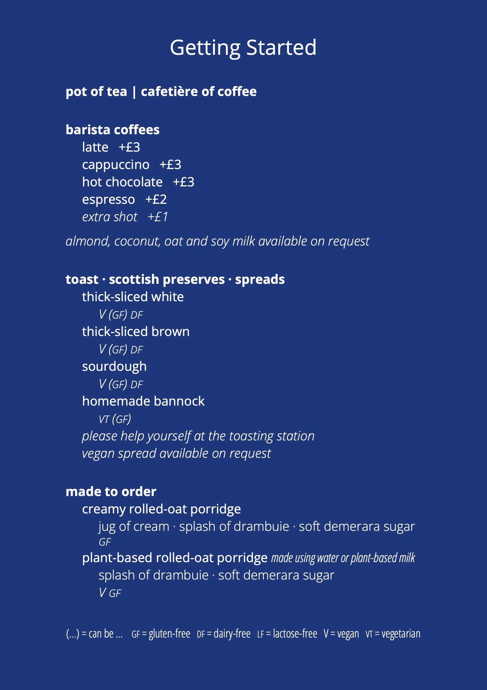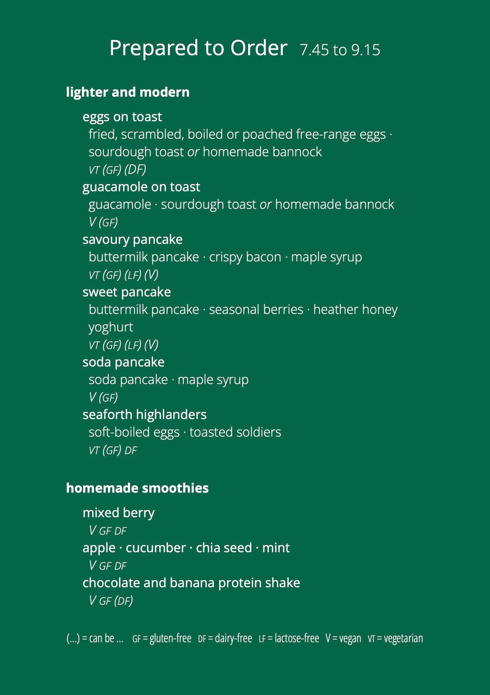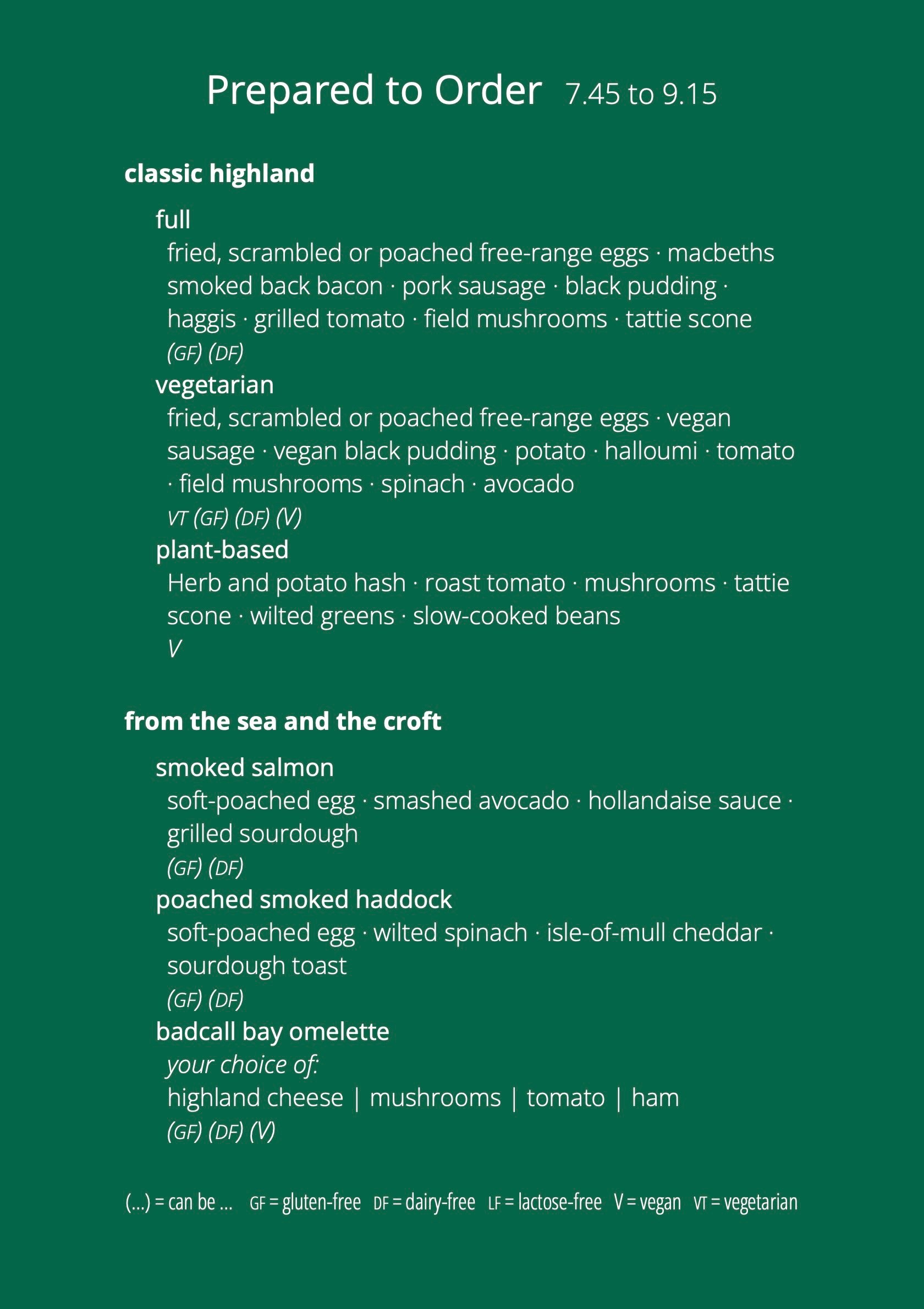 Breakfast is included in all our accommodation rates and served in the restaurant from 7.45 am each day. Seating is “free choice”, although those guests accompanied by dog(s) should choose a table in the dog-friendly area. Please note, a new breakfast menu will be launched for season 2026, although many of the favourites below will be retained.
