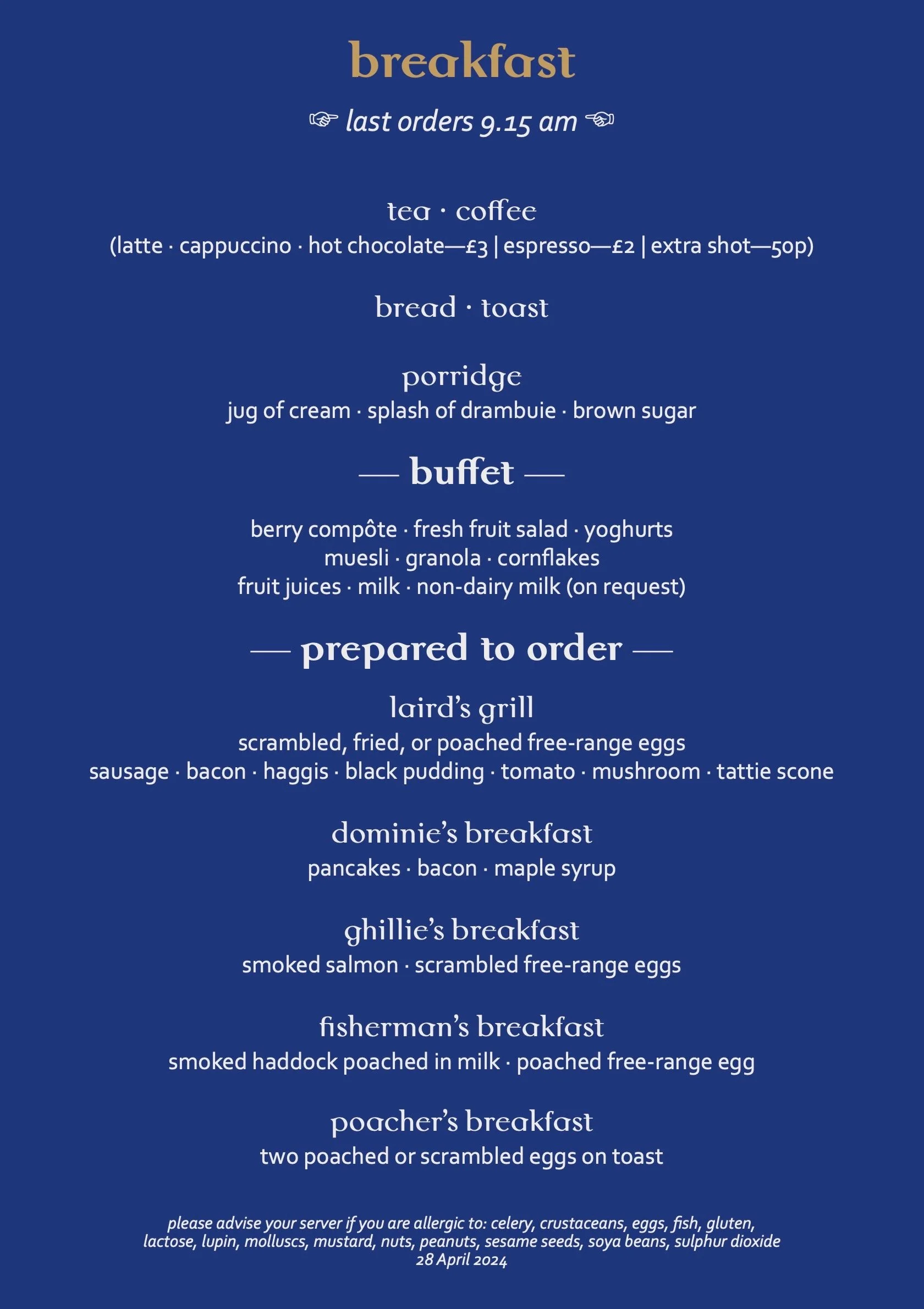 Breakfast is included in all our accommodation rates and served in the restaurant from 7.45 am each day. Seating is “free choice”, although those guests accompanied by dog(s) should choose a table in the dog-friendly area.