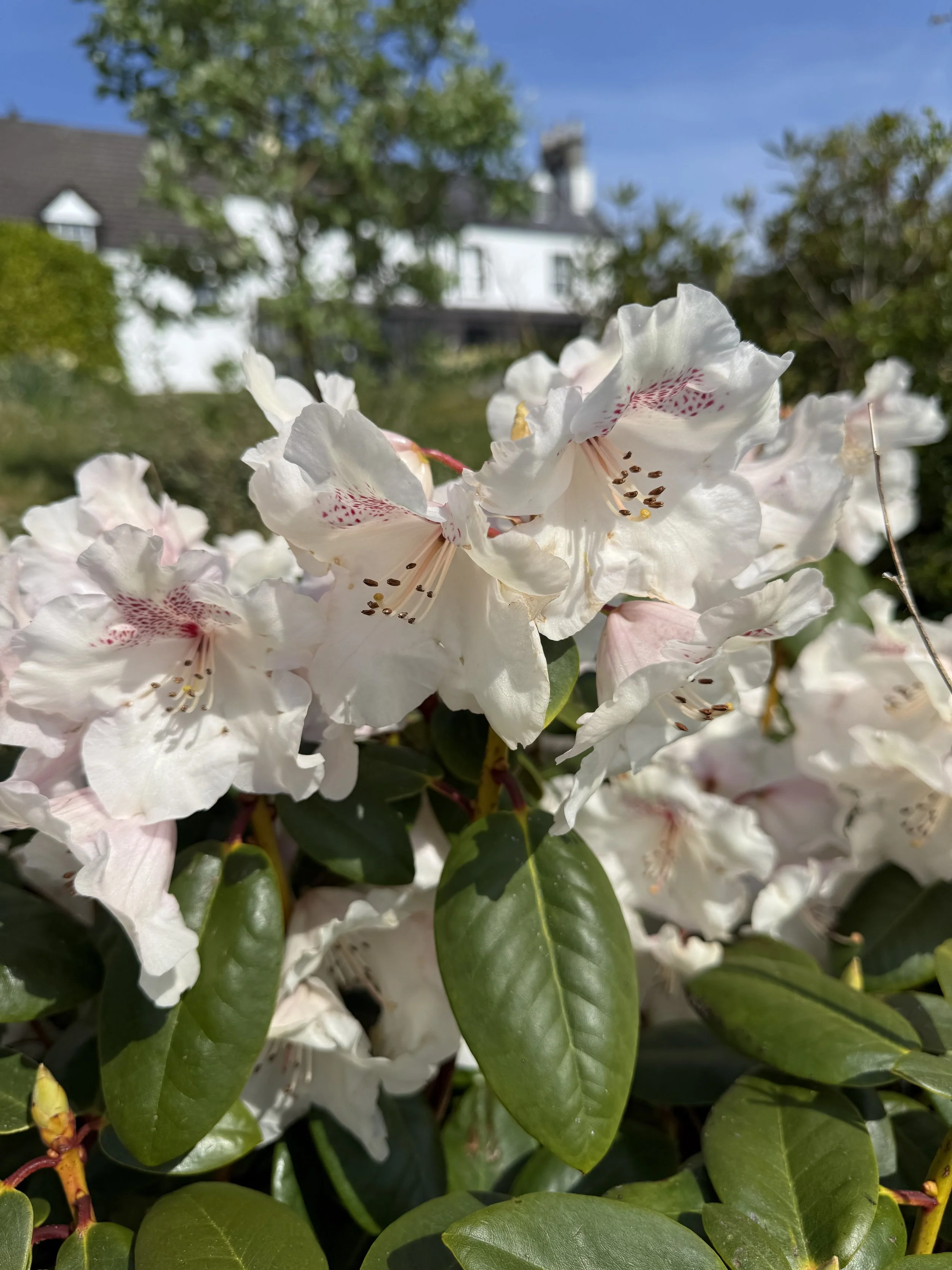 Rhododendrons and azaleas span the flowering season from April through July. We source non-invasive Scottish-grown varieties from Glendoick, choosing hardy forms that can withstand exposure. Those planted in 2018 now bloom reliably each spring; more recent additions from 2020-21 are contributing their first flowers. During the pandemic depths, planting these for an uncertain future felt like an act of faith—and a fair bit of Highland defiance.