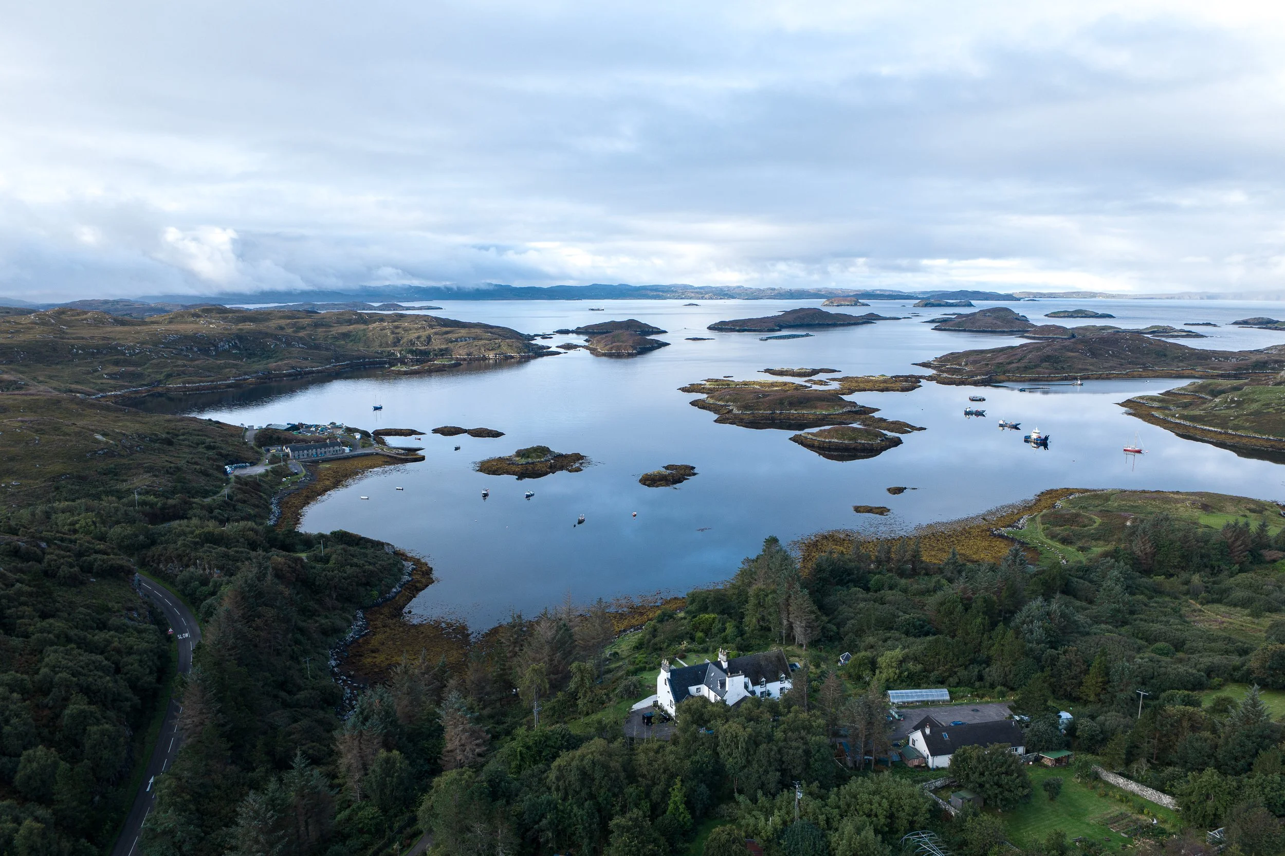 Arriving at Eddrachilles, you leave the A894 and turn down a driveway that brings you to a former Church of Scotland manse, built in the 1800s, overlooking Badcall Bay. The building sits quietly above the shore. Ten rooms. A small team. No sense of throughput. Arrival is unhurried.