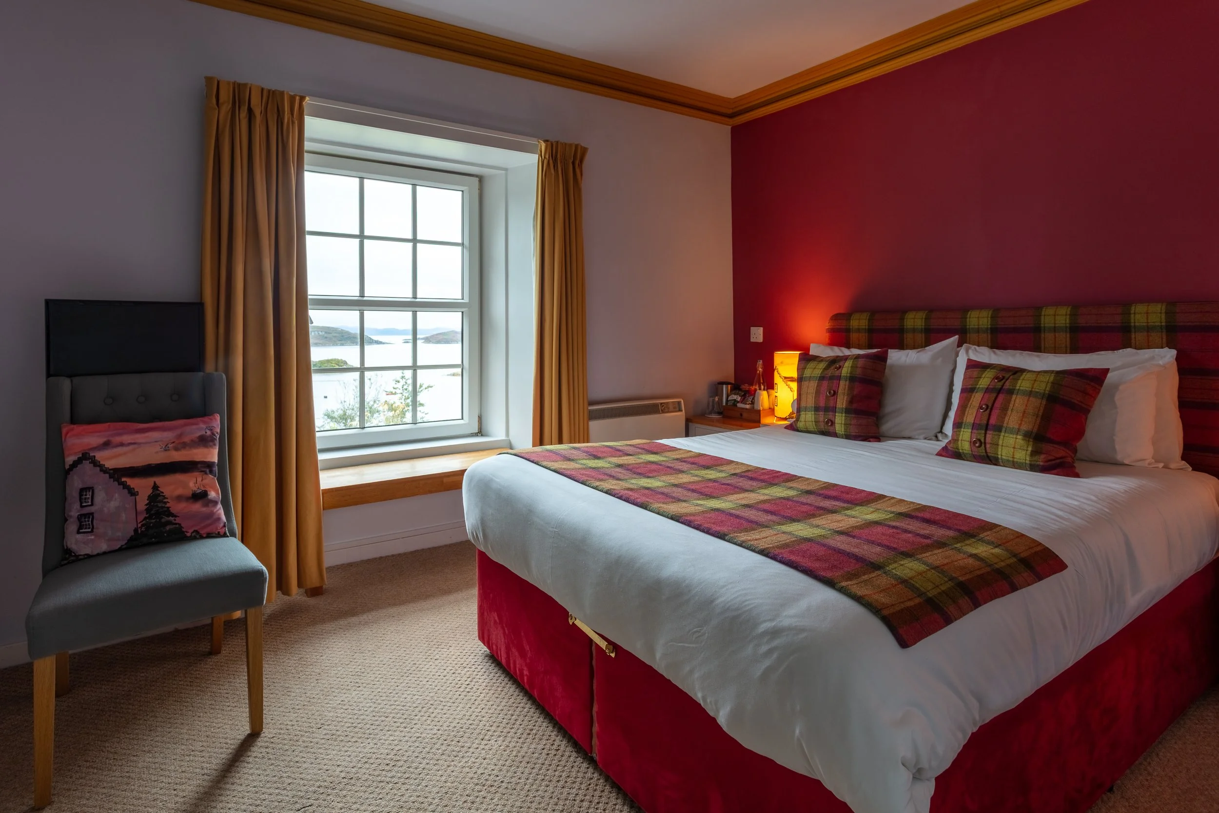 Our south-facing rooms look across Badcall Bay towards the islands and the mouth of the fjord-like inlet. Each room has its own shape, following the lines of the house, and the views are the unifying feature.