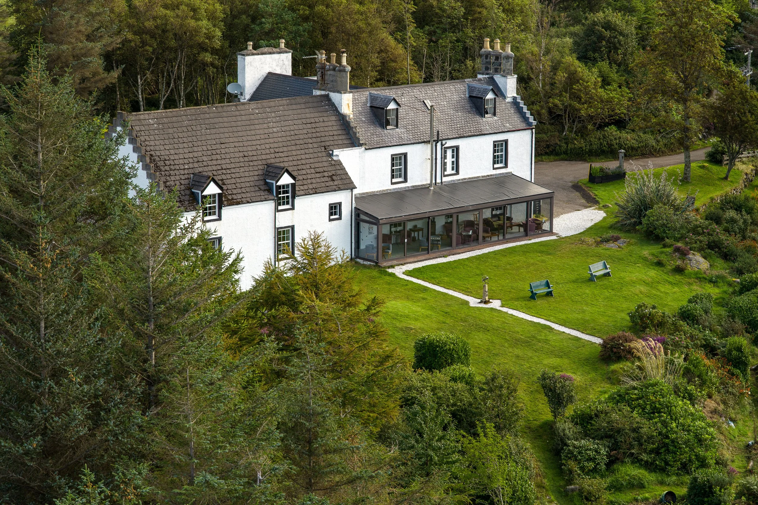 Eddrachilles began life in the 1800s as a manse — a Church of Scotland minister’s home — built on the hillside above Badcall Bay. That heritage still shapes the character of the building today. Rooms in both the original building and the sympathetic later extension follow Church’s original design: solid, peaceful, comfortable, honest in scale and layout, and a far cry from purpose-built, uniform, modern chain hotels..