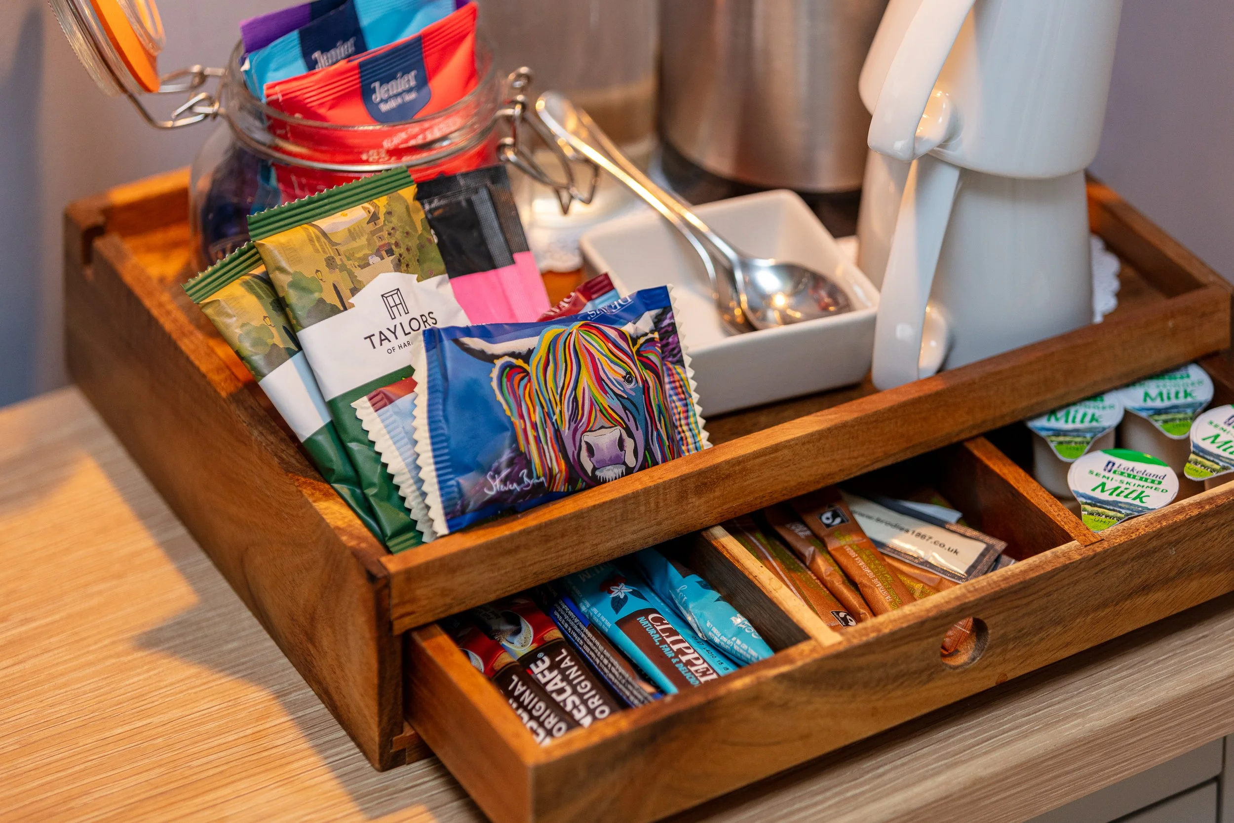 Hospitality tray with Jenier teas, coffee, hot chocolate & biscuits