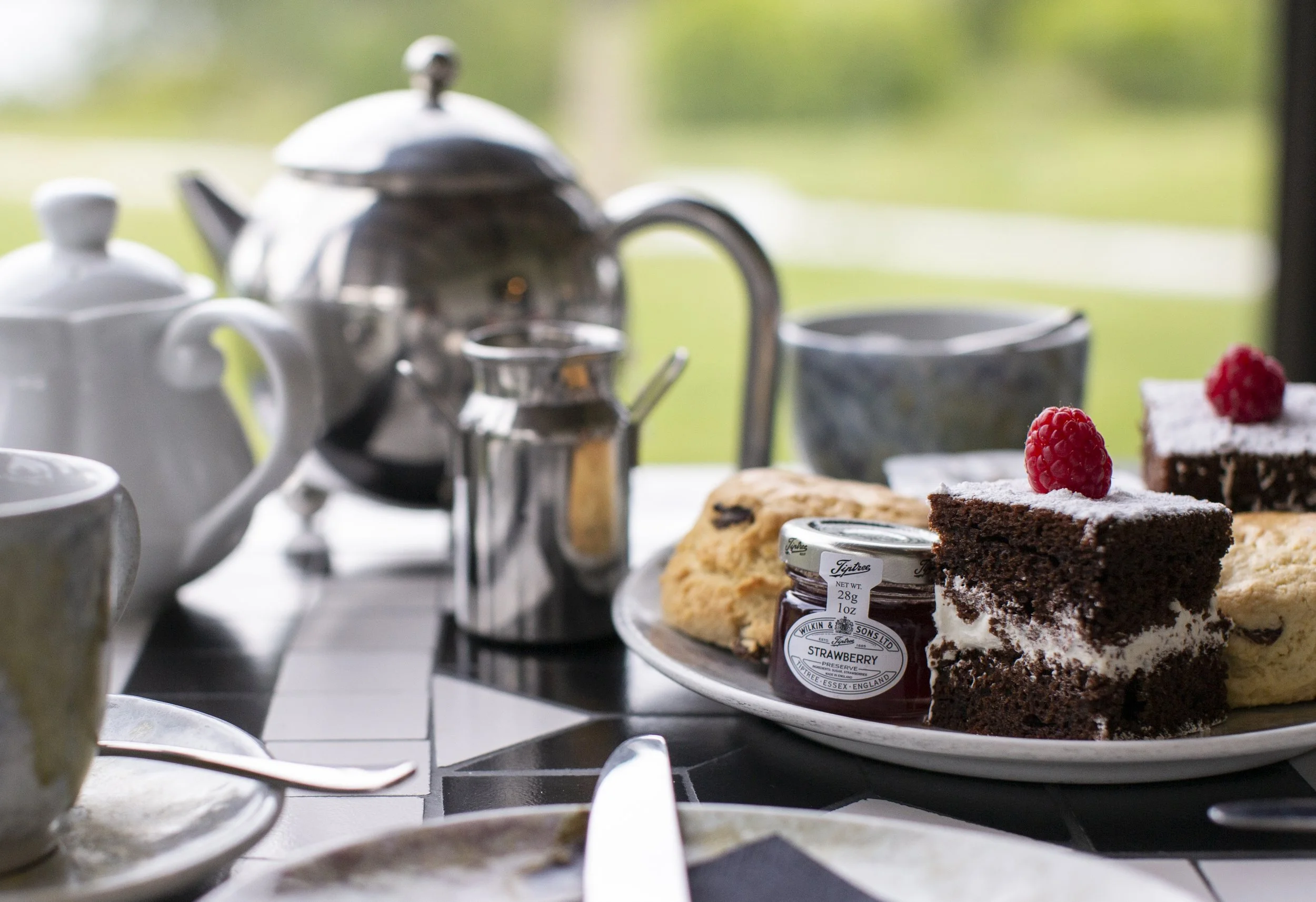 Every afternoon we serve a complimentary Highland tray with home baking from The Glebe Kitchen — often scones with jam and clotted cream, shortbread, or a seasonal baking treat.
